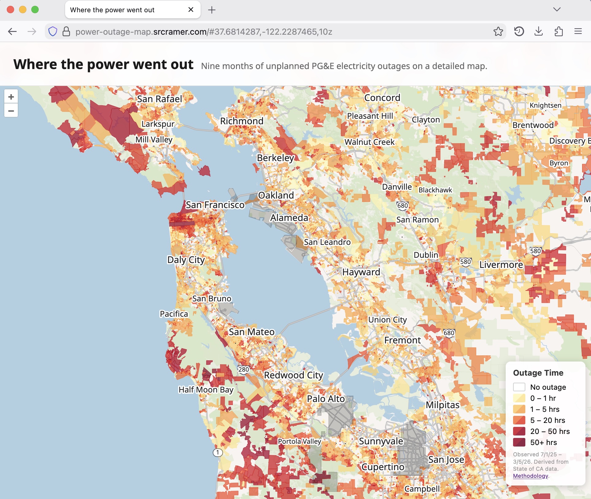 I opted to let the PG&E boundaries generally reflect the official maps, but still show the power outages under them. If you have any ground-level information about where people in these conflicting areas get their power, please do reach out so I can correct my visualization.